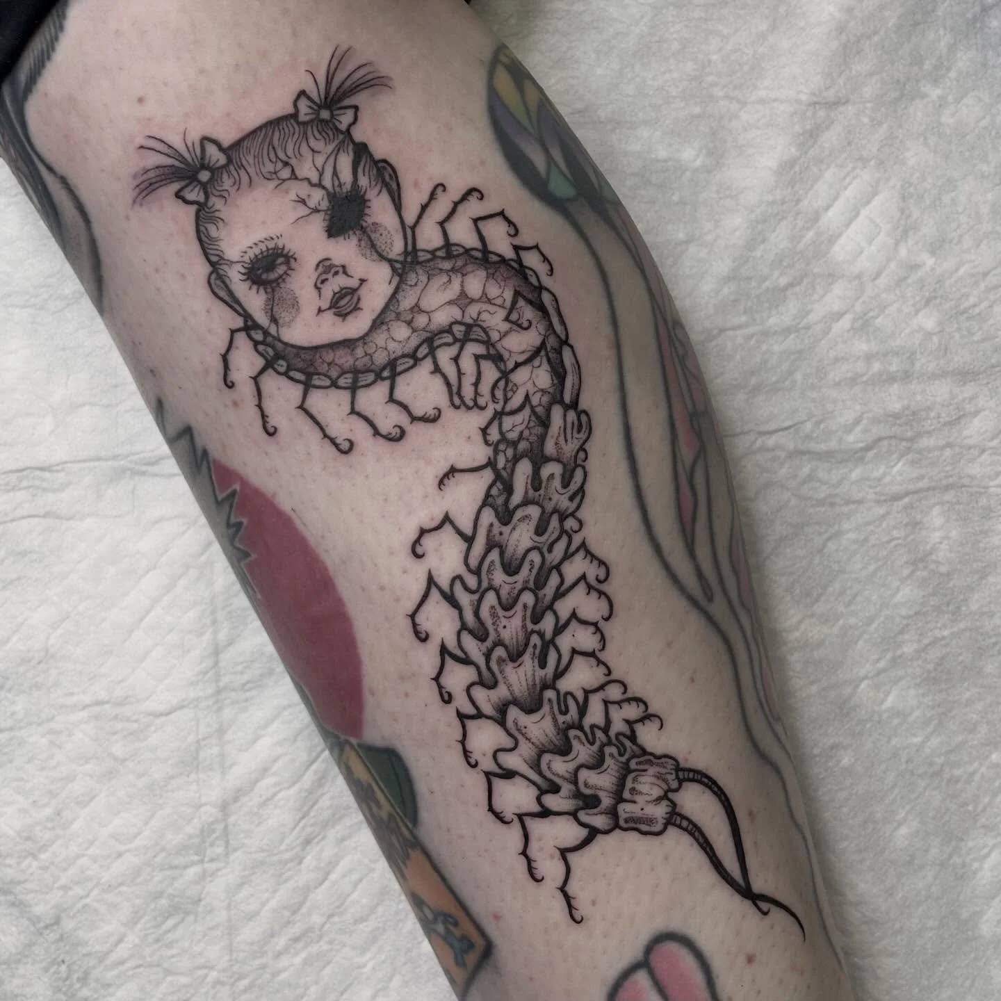 View fullsize Tattooed this doll headed creepy crawly centipede on the side of @lexiebye 's leg today! ❀️